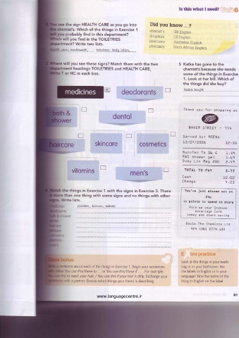 about each of the things in Exercise 1. Begin your senrences bag or in your bathroom. Are